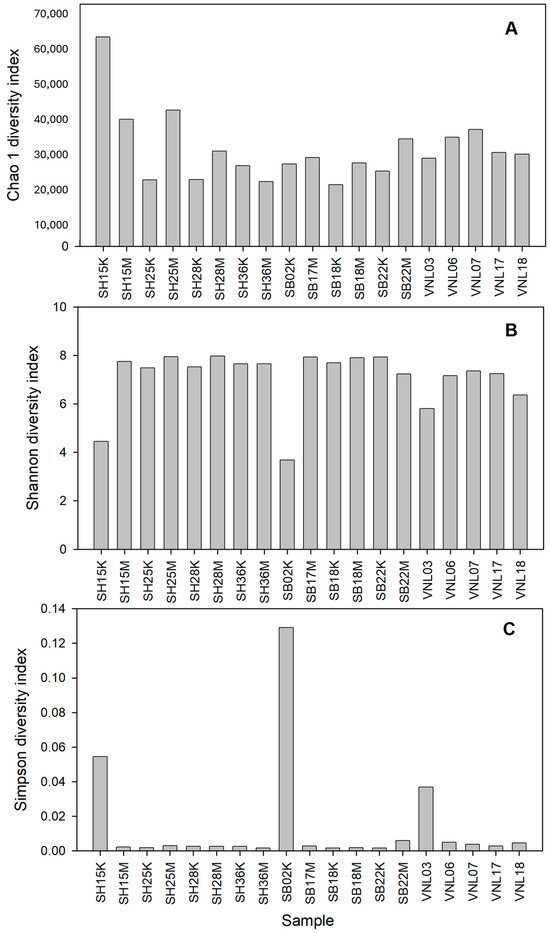 The alpha-diversity indices of the bacterial communities in the samples. Note: (A): Chao 1 index; (B): Shannon index, and (C): Simpson index.