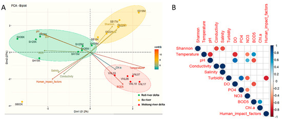 PCA and correlation analysis showing the relationships between alpha–diversity (represented by the Shannon index) of the bacterial communities in the samples and environmental factors, as well as human impact. Notes: (A): the PCA plot; (B): the score matrix showing the correlations between different pairs of factors (only significant values lower than 0.05 were shown).