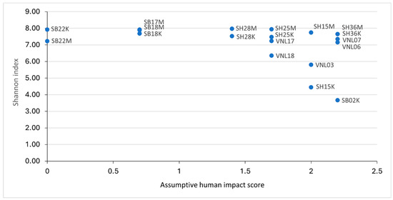 The correlations between the Shannon indices of the samples with their respective assumptive human impact scores.