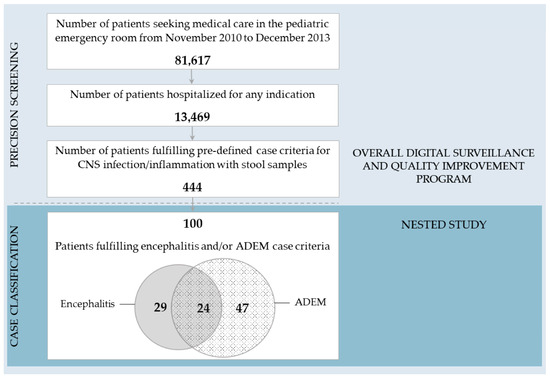 The present nested study was limited to 100 patients/patient samples for logistical and cost constraints. We selected all patients fulfilling encephalitis and/or ADEM case criteria within the overall digital surveillance and quality improvement program, arriving at 100 encephalitis/ADEM patients from November 2010 to December 2013 (Figure 1).