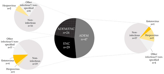 In line with previous studies, few encephalitis and ADEM cases in our study (13%) held a specific infectious diagnosis in routine care. Review of the patients’ medical records revealed inconsistent proceedings in the diagnostic work-up, including one diagnosis of ‘enterovirus infection’ based on clinical suspicion only. This exemplified the potential pitfalls of retrospective chart review of ICD codes and discharge summaries for scientific or surveillance purposes.