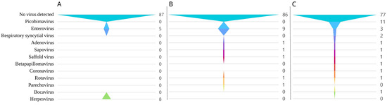 Funnel chart of absolute numbers/percentage of virus detection results from (A) routine care discharge diagnoses, (B) combined mNGS and PCR, and (C) mNGS only among the same encephalitis/ADEM patients (n = 100). Note that for (B), PCR testing for picobirnavirus, respiratory syncytial virus, betapapillomavirus, and coronavirus could not be performed and, thus, case numbers were cautiously set to 0 for those viruses.