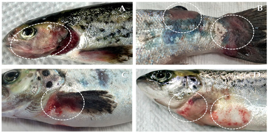 Some of the external symptoms of Atlantic salmon infected with Saprolegnia parasitica are indicated with white dotted circles. (A) Necrotic lesions on gills and gill cover. (B,C) Ulcers and hemorrhage on fins. (D) Hemorrhage on abdomen. The white dotted circles indicate symptoms.
