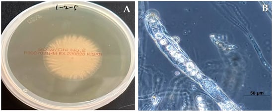Morphological characteristics typically observed in Saprolegnia parasitica isolated from Atlantic salmon. (A) Colonies grown on SD agar supplemented with chloramphenicol after culturing S. parasitica. (B) The mycelium is thin and elongated, lacks septa, and also exhibits zoosporangium and zoospores.