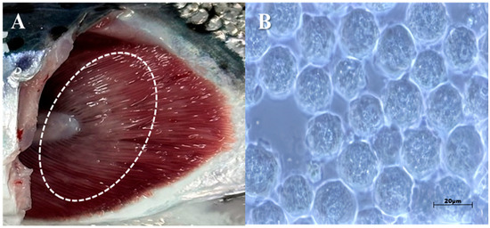 Out of 20 Atlantic salmon, 16 individuals (80%) were found deceased concurrently with the detection of parasites. The comparison of genetic sequences of pathogens isolated from Atlantic salmon using the nucleotide of Neoparamoeba species revealed an amplified product at 630 bp. Furthermore, phylogenetic analysis revealed a 99% sequence identity of N. perurans (Figure 3B). The symptoms following N. perurans infection included excessive mucus secretion in the gills, reduced swimming ability, respiratory distress, and anorexia. After mortality, the mouth and gill covers were completely open. As a clinical symptom, clusters of N. perurans, appearing as multiple white spots, were densely packed on the gill filaments and visible to the naked eye (Figure 4A).