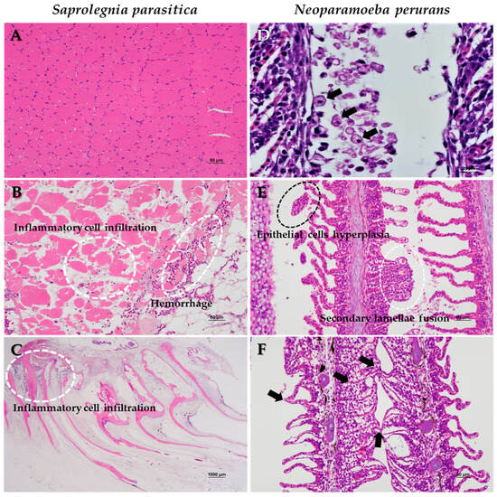 Histopathological analysis results of Atlantic salmon infected with Saprolegnia parasitica (A–C) and Neoparamoeba perurans (D–F). (A) Normal abdominal muscles of the Atlantic salmon. (B) The abdominal muscles of Atlantic salmon infected with S. parasitica. The white dotted circles indicate inflammatory cell infiltration, necrosis, and hemorrhage. (C) The gill covers of Atlantic salmon infected with S. parasitica. The white dotted circles indicate inflammatory cell infiltration. (D) Gills infected with N. perurans. The black arrows indicate N. perurans. (E) As a result of the infection, there is hyperplasia of epithelial cells and fusion of secondary lamellae. The black dotted circle indicates epithelial cells hyperplasia; the white dotted circle indicates fusion of secondary lamellae. (F) Multiple lamellae show fusion and adhesion. The black arrows indicate that the lamellae are involved in adhesion and fusion.