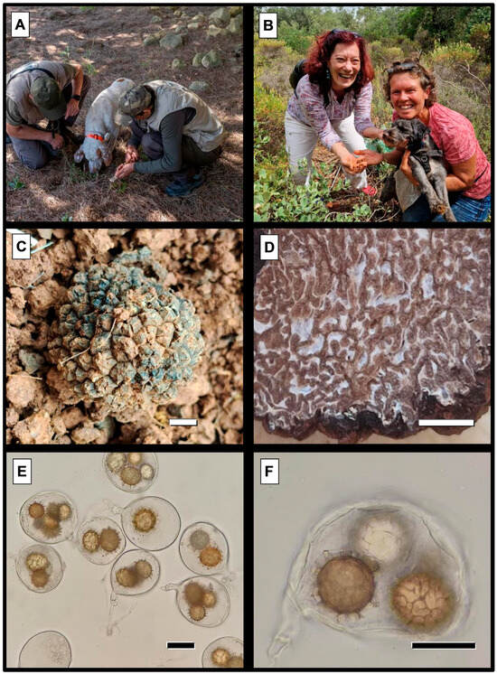 Tuber aestivum specimens collected in Portugal. (A) Left to right: Giovanni Longo, Pina (dog) and Tanka Sapkota, at 1016 sample location site (https://www.nit.pt/wp-content/uploads/2024/06/49bdcfdd344747a0f30a145d5f6625b1-e1717409790694.jpg, accessed on 28 June 2024). (B) Left to right: Celeste Santos-Silva, Larissa Müller and Figo (dog) at 1022 sample location site (Algarve Truffle Group). (C) T. aestivum ascomata (Larissa Müller). (D). T. aestivum gleba (Celeste Santos-Silva). (E,F) T. aestivum asci and ascospores (Celeste Santos-Silva). Bars: (C,D) = 1 cm; (E,F). = 30 µm.