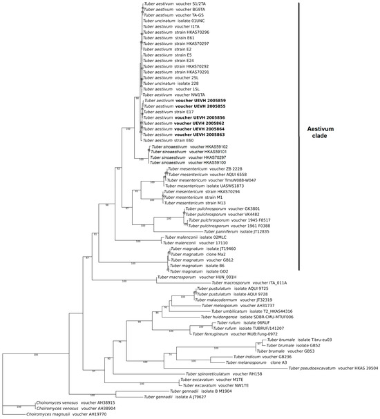 Phylogenetic placement of Tuber aestivum specimens obtained in this study (bold) in the Aestivum clade. The consensus tree represents a Bayesian approximation with 1000 generations and a maximum likelihood analysis with 1000 bootstrap replicates. The tree is based on the ITS rDNA sequence alignment of 70 sequences assigned to 22 Tuber taxa. ITS rDNA sequences of Choiromyces venosus and C. magnusii were used as the outgroup. Bootstrap supports are shown at the nodes of the branches.
