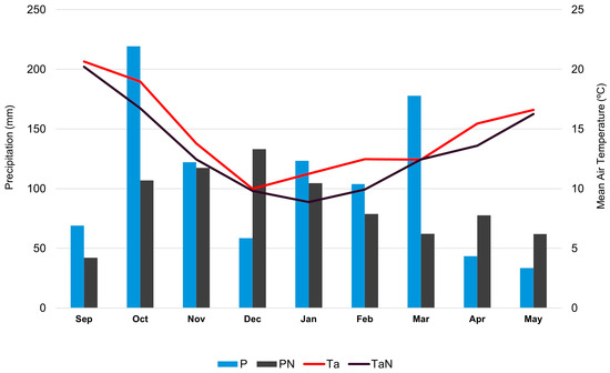 Continental Portugal month precipitation (P) and the mean air temperature (Ta) from September 2023 to May 2024. Climatological standard normals (1941–2023) per month for precipitation (PN) and mean air temperature (TaN) (data from https://www.ipma.pt/pt/publicacoes/, accessed on 26 June 2024).