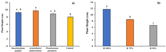Plant growth promoting rhizobacteria (PGPR) inoculation (a) and substrate moisture content (b) effect on Cucumis sativus height. Columns with different letters are statistically different (Tukey’s, p < 0.05).