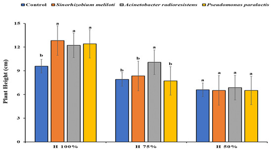 Plants inoculated with PGPR increased in height significantly with respect to the control (121%) (Figure 1a). Substrate moisture at 100% (H 100%) affected plant height by 177% compared to H50% (Figure 1b). The effect of the interactions showed significant differences (Figure 2); substrate moisture at H100% and PGPR increased height by 145% in plants that were not inoculated, whereas the Acinetobacter radioresistens strain showed significant differences with substrate moisture at H75% with respect to other treatments, favoring plant growth by 130% compared with the control group. No statistical differences were observed in PGPR and substrate moisture at H50%.