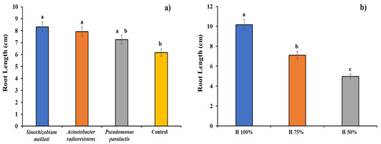 Plant growth promoting rhizobacteria (PGPR) inoculation (a) and substrate moisture content (b) effect on Cucumis sativus root length. Columns with different letters are statistically different (Tukey’s, p < 0.05).