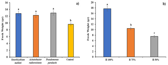 Plant growth promoting rhizobacteria (PGPR) inoculation (a) and substrate moisture content (b) effect on Cucumis sativus fresh weight. Columns with different letters are statistically different (Tukey’s, p < 0.05).
