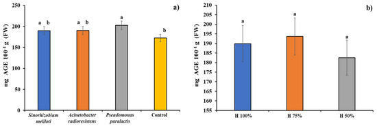Plant growth promoting rhizobacteria (PGPR) inoculation (a) and substrate moisture content (b) effect on Cucumis sativus antioxidant capacity. Columns with different letters are statistically different (Tukey’s, p < 0.05).