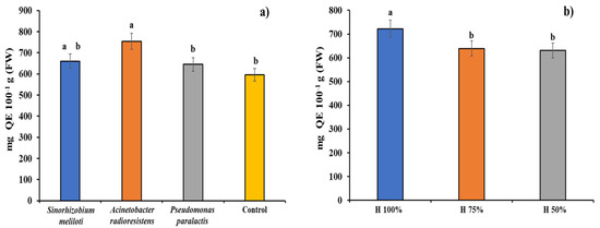 Plant growth promoting rhizobacteria (PGPR) inoculation (a) and substrate moisture content (b) effect on Cucumis sativus flavonoid content. Columns with different letters are statistically different (Tukey’s, p < 0.05).