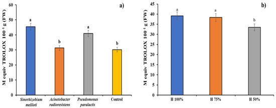 The inoculant response with S. meliloti and P. paralactis on C. sativus antioxidant capacity was statistically significant since it increased by 150% compared to non-inoculated plants (Figure 8a). Substrate moisture content at H100 and H75% showed significant differences with respect to substrate moisture content at H50%, and antioxidant capacity increased 116% (Figure 8b). Nevertheless, the analysis of variance did not show significant differences in the interactions of the inoculants used and the substrate moisture contents.