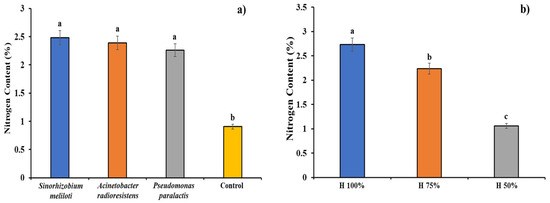 Plant growth promoting rhizobacteria inoculation (a) and substrate moisture content (b) effect on Cucumis sativus nitrogen (N) content. Columns with different letters are statistically different (Tukey’s p < 0.05).
