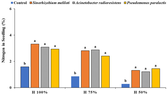 Root elongation increased N and P assimilation in plants with PGPR; as reported, S. meliloti has the capacity of fixing nitrogen [34] and A. radioresistens and P. paralactis may produce ammonia [35]. According to the results obtained, a greater N content in plants may be explained in plants inoculated with PGPR compared to the control group since N content may affect apoplastic and symplastic ammonia transport in radicle and tissues, such as adventitious roots and endodermic and cortical roots [36]. Additionally, observations [37] have reported that the lack of moisture affects ammonia transport; thus, the results obtained on N assimilation with respect to moisture may be lower. Likewise, the symbiotic effect of PGPR inoculation in relation to greater amounts of humidity benefits N assimilation in seedlings.