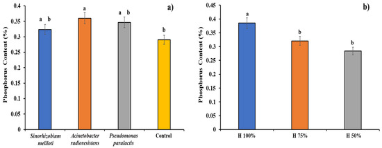Plant growth promoting rhizobacteria (a) and substrate moisture content (b) on Cucumis sativus phosphorus content. Columns with different letters are statistically different (Tukey’s, p < 0.05).