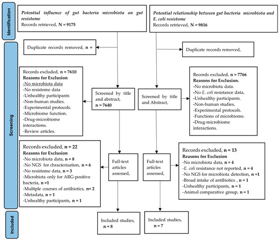 PRISMA flow diagram indicating the screening and final selection of studies used to examine the potential influence of the gut microbiota on the gut and E. coli resistome.