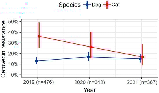 Statistical analysis was carried out using R version 4.2.2 from the R Foundation Vienna [19] and the AMR package [20]. Our presentation features resistance proportions alongside their corresponding 95% Wilson confidence intervals (95% CI). These proportions and intervals are determined for various subgroups, such as species and species/sample type. Temporal trends in cefovecin resistance were assessed using the Cochrane–Armitage test.