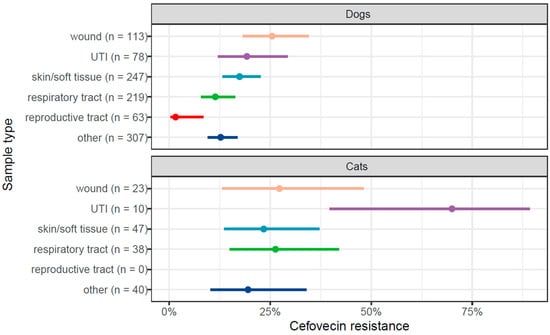 Organ-specific proportion of cefovecin resistance among K. pneumoniae isolated from dogs and cats’ samples, including 95% confidence intervals.