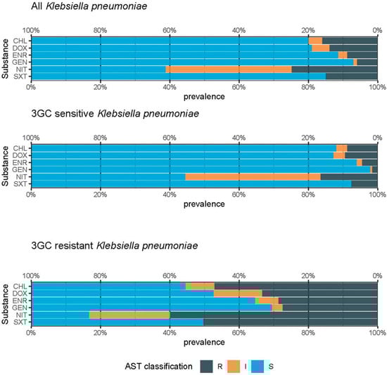 With regard to 3GC-sensitive K. pneumoniae, the isolates showed resistance proportions of less than 20% to all antimicrobial substances.