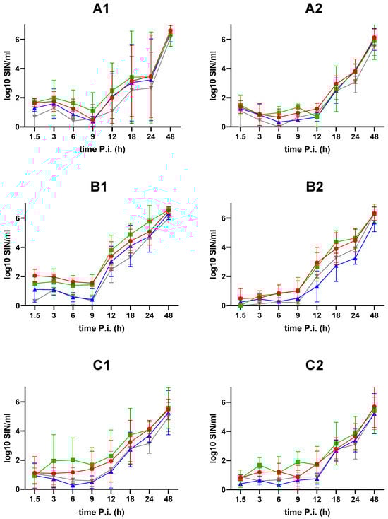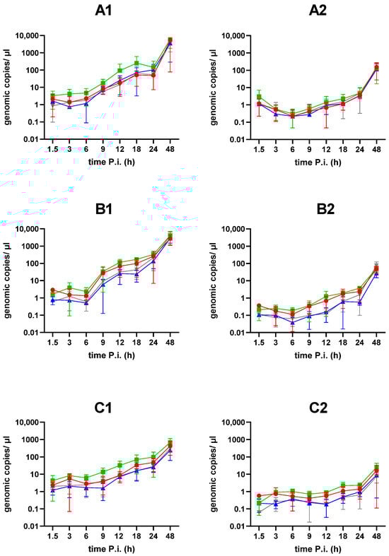 Viral replication kinetics of BE18 (red circle), E70 (green square), EST (blue triangle) and NHV (grey inverted triangle). PAMs (A1), MDMs (B1), and spleen macrophages (C1) were collected and the infectious virus titer was determined by an IPT. The supernatants from the PAMs (A2), MDMs (B2) and spleen macrophages (C2) were collected after separation from the cells and the infectious virus titer was assessed by an IPT. No statistically significant differences were observed between the strains.