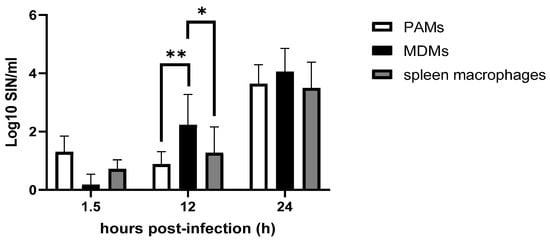 The supernatants from infected PAMs (white), MDMs (black) and spleen macrophages (grey) were collected after separation from the cells. The infectious virus titers were assessed by an IPT. At 12 hpi, mean titers were significantly higher in MDMs (2.23 ± 1.04) compared to PAMs (0.88 ± 0.43) (p < 0.01) and spleen macrophages (1.27 ± 0.89) (p < 0.05). * p-value < 0.05; ** p-value < 0.01.