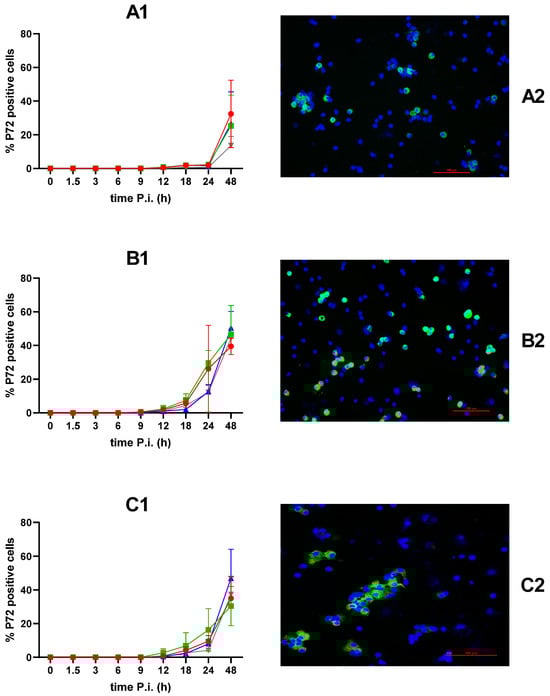 The percentage ASFV-infected cells with BE18 (red circle), E70 (green square), EST (blue triangle) and NHV (grey inverted triangle) was quantified through immunofluorescence staining in PAMs (A1), MDMs (B1) and spleen macrophages (C1). (A2,B2,C2) illustrate representative IF pictures of PAMs, MDMs and spleen macrophages, respectively, at 48 hpi with BE18. The nuclear staining (blue) and the viral P72 antigen (FITC) are visualized with a 20× objective. No statistically significant differences were observed between the strains.