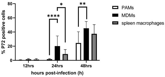 The percentage of ASFV-infected PAMs (white), MDMs (black) and spleen macrophages (grey) was quantified through immunofluorescence staining. The mean percentages of infected cells between the different cell types were compared. At 24 hpi, significantly more MDMs (20.19 ± 14.30) compared to PAMs (1.64 ± 0.98) and spleen macrophages (8.89 ± 6.38) were positive for the P72-protein. Furthermore, at 48 hpi, MDMs presented the highest number of ASFV-infected cells (45.22 ± 9.64), followed by spleen macrophages (37.43 ± 13.00) and PAMs (24.50 ± 15.91), with significant differences between MDMs and PAMs. * p-value < 0.05; ** p-value < 0.01; **** p-value <0.001.