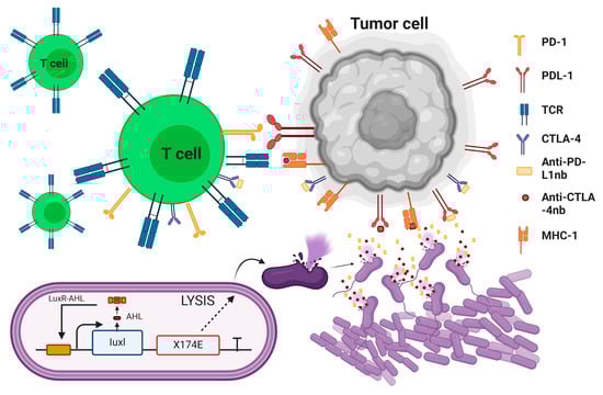 It is known that there are bacteria that grow and cluster around malignant tissues without causing infections [73]. Therefore, a probiotic bacterium was designed to synthesize and release antibodies to block immune system regulators used by cancer cells (Figure 3). This occurred when the bacterial count reached a critical level, inducing lysis in the tumor microenvironment, thus releasing the PD-L1- and CTLA-4-blocking antibodies [77], which are produced through a programmed genetic circuit [74]. The released antibodies (rCTLA-4nb and rPD-L1) bind to PD-L1 and CTLA-4 receptors, blocking them. This approach was tested in mice with efficient results. Moreover, due to their greater diffusion and rapid elimination through glomerular filtration, they provide a guarantee in reducing off-target effects [78].