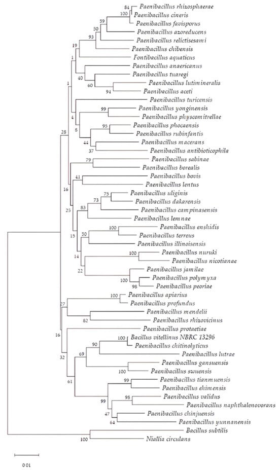 Neighbor-joining phylogenetic tree based on the complete 16S rRNA gene sequence extracted from assembled genome. The relationships between closely related species of type cultures from genus Paenibacillus are demonstrated. The analysis, performed using MEGA 11, demonstrates that P. chitinolyticus HSCC 596T is its closest neighbor. The GenBank accession numbers for the type strains shown in the phylogenetic tree are as follows: B. vitellinus NBRC 13296 (CP167173), Bacillus subtilis IAM 12118 (NR112116.2), Microbacterium oxydans DSM 20578 (NR044931.1), Peribacillus frigoritolerans DSM 8801 (NR115064.1), Brevibacterium casei DSM 20657 (NR041996.1), Brevibacterium aurantiacum NCDO 739 (NR044854.1), P. chitinolyticus HSCC 596 (NR040854.1), P. gansuensis B518 (NR043219.1), P. lutrae N10 (NR173496.1), P. favisporus GMP01 (NR29071.1), P. yonginensis DCY84 (NR148738.1), P. polymyxa DSM 36 (NR117730.2), P. rhizosphaerae CECAP06 (NR043166.1), P. swuensis DY6 (NR178528.1), P. turicensis MOL722 (NR114621.1), P. uliginis N3/975 (NR117012.1), P. peoriae KCTC 3763 (NR117742.1), P. bovis BD3526 (NR148890.1), P. apiarius DSM 5581 (NR040890.1), P. tianmuensis B27 (NR116789.1), P. sabinae T27 (NR122065.1), P. nuruki TI45-13ar (NR180160.1), P. lutimineralis MBLB1234 (NR165675.1), P. relictisesami KB0549 (NR133806.1), P. validus JCM 9077 (NR040892.1), Fontibacillus aquaticus GPTSA 19 (NR115664.1), P. mendelii C/2 (NR041929.1), P. azoreducens (CM1 NR025391.1), P. ehimensis IFO 15659 (NR112054.1), P. rhizovicinus 14171R-81 (NR181067.1), P. protaetiae FW100M-2 (NR180424.1), P. lentus CMG1240 (NR118573.1), P. cineris LMG 18,439 (NR042189.1), P. profundus Sl 79 (NR132304.1), P. phocaensis mt24 (NR179441.1), P. naphthalenovorans PR-N1 (NR028817.1), P. lemnae L7-75 (NR178252.1), P. illinoisensis JCM 9907 (NR040884.1), P. jamilae CECT 5266 (NR042009.1), P. chinjuensis WN9 (NR025024.1), P. nicotianae YIM h-19 (NR134783.2), P. macerans IAM 12467 (NR040886.1), P. borealis KK19 (NR025299.1), P. physcomitrellae XB (NR137363.1), P. dakarensis FF9 (NR169361.1), P. terreus D33 (NR147741.1), P. aceti L14 (NR151978.1), P. yunnanensis YN2 (NR145625.1), P. chibensis JCM 9905 (NR040885. 1), P. tuaregi Marseille-P2472 (NR179515.1), P. antibioticophila GD11 (NR144710.1), P. rubinfantis MT18 (NR179433.1), P. campinasensis JCM 11200 (NR112162.1), P. anaericanus Gsoil 1638 (NR041380.1), and N. circulans ATCC 4513 (NR104566.1).