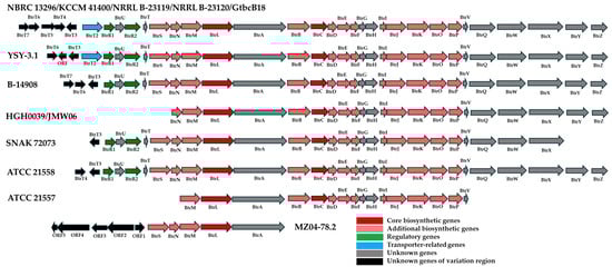 Enzymatic studies of the butirosin biosynthetic pathway have led to remarkable scientific advances in Niallia circulans, with BGCs for N. circulans SANK 72073, N. circulans ATCC 21557, and N. circulans ATCC 21558 [4,25,26] identified in the NCBI database. First, we obtained a large gene cluster from BtrA to BtrZ based on the butirosin BGC of N. circulans SANK 72073 and the BGC of N. circulans ATCC 21,558, extended by genomic walking. We then identified additional genes in the upstream and downstream regions of the genome of B. vitellinus NBRC 13296, in addition to the tentative butirosin BGCs in region 12 analyzed by antiSMASH. As shown in Figure 2 and Table S5, B. vitellinus NBRC 13296 and the butirosin BGC from N. circulans share 67.81% to 92.87% high homology. Interestingly, during a BLASTP search for region 12 derived by antiSMASH, putative butirosine BGCs were identified in the type strain P. chitinolyticus KCCM 41,400, as well as in P. chitinolyticus NRRL B-23119, P. chitinolyticus NRRL B-23120, P. chitinolyticus B-14908, P. chitinolyticus YSY-3.1, P. chitinolyticus JMW06, Paenibacillus sp. GbtcB18, Paenibacillus sp. HGH0039, and Paenibacillus sp. MZ04-78.2. Next, we analyzed the genetic similarities and differences between B. vitellinus NBRC 13296, N. circulans, and the putative butirosin BGCs identified in Paenibacillus sp. The results showed that all BGCs had the following genes in common: BtrT, BtrS, BtrN, BtrM, BtrL, BtrA, BtrB, BtrC, BtrD, BtrD, BtrE, BtrF, BtrG, BtrH, BtrI, BtrI, BtrJ, BtrK, BtrO, BtrP, and BtrV were located in the same transcriptional orientation, followed by the BtrQ, BtrW, BtrX, BtrY, and BtrZ genes upstream of these core regions in the same transcriptional orientation and consecutive order. In contrast, the enzymes BtrT, BtrR2, BtrU, and BtrR1 are commonly found downstream of the core region, but, beyond this, the genes are arranged in a strain-specific manner. Specifically, B. vitellinus NBRC 13296, P. chitinolyticus KCCM 41400, P. chitinolyticus NRRL B-23119, P. chitinolyticus NRRL B-23120, and Paenibacillus sp. GbtcB18 B18 show the same genetic organization from BtrT2 to BtrT7, while P. chitinolyticus YSY-3.1 is similar only up to BtrT2, and the remaining strains lack some of the BtrT3 to BtrT7 genes. Furthermore, Paenibacillus sp. MZ04-78.2 contained five completely unrelated ORFs instead of the BtrT, BtrR2, BtrU, and BtrR1 genes. Finally, we sought to deduce the minimal unit of the butirosin BGC. Many classes of secondary metabolite BGCs, such as aminoglycosides, type I polyketides, type II polyketides, indolocarbazoles, and enediynes, are often accompanied by regulatory and resistance genes [27,28,29,30,31]. Therefore, it is likely that these genes are also present in the butirosin BGC. Based on these findings, it is highly likely that the regulatory genes BtrR1 and BurR2 are included in the butirosin BGC, as are all or part of the transporter genes BtrT2, BtrW, BtrX, and BtrY, which may act as resistance genes. However, further studies, such as heterologous expression or enzymatic approaches, are required.