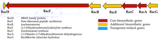 In this study, genome mining using the antiSMASH, BAGEL 4, and PRISM programs revealed 22 gene clusters encoding the biosynthesis of diverse secondary metabolites in the genome of B. vitellinus NBRC 13296. The secondary metabolite analysis using antiSMASH, as detailed in Table 1, confirmed the presence of BGCs in the B. vitellinus genome that exhibit 100% homology to previously characterized gene clusters involved in the biosynthesis of bacillibactin and bacillopaline. Bacillibactin is a cyclic trimeric ester composed of 2,3-dihydroxybenzoic acid (DHB) and glycine-threonine, forming a macrolactone ring structure. Bacillibactin functions as a siderophore—a specialized molecule synthesized by certain bacteria to sequester iron from the environment, which is crucial for survival under iron-limited conditions. The genus Bacillus, particularly Bacillus subtilis, is well known for producing bacillibactin. This model organism for Gram-positive bacteria synthesizes bacillibactin as part of its iron acquisition strategy, particularly when the iron availability is low [32]. Bacillibactin BGCs have been identified not only in Bacillus species but also in a variety of other bacteria [33]. These BGCs typically encode key enzymes such as non-ribosomal peptide synthetase (NRPS), isochorismatase, (2,3-dihydroxybenzoyl) adenylate synthase, isochorismate synthase, 2,3-dihydro-2,3-dihydroxybenzoate dehydrogenase, and bacillibactin hydrolase. In the B. vitellinus BGCs, these genes are organized similarly, with an additional 65-amino-acid MbtH family protein, forming an operon-like BGC in the same transcriptional orientation (Figure 3). Understanding bacillibactin’s structure and function provides crucial insights into microbial iron acquisition strategies and offers potential avenues for the development of antimicrobial therapies that target siderophore-mediated iron uptake in pathogenic bacteria.