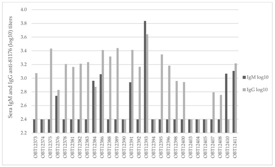 Anti-C. jejuni IgM and IgG antibodies log10 titers in sera samples from GBS patients. Sample values above the cut off (0.4 O.D. units above the background at 1:500 dilution (log10 = 2.4)) were considered positive.