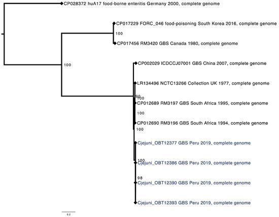 - Quino, W.; Caro-Castro, J.; Mestanza, O.; Hurtado, V.; Zamudio, M.L.; Cruz-Gonzales, G.; Gavilan, R.G. Emergence and Molecular Epidemiology of Campylobacter Jejuni ST-2993 Associated with a Large Outbreak of Guillain-Barré Syndrome in Peru. Microbiol. Spectr. 2022, 10, e01187-22. [Google Scholar] [CrossRef] [PubMed]
