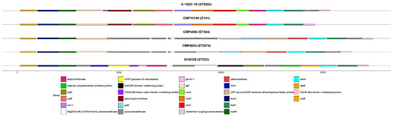 ST354 and ST3874 also exhibited a high degree of similarity, with ST354 containing a single additional glycosyltransferase gene in the middle of the LOS region. Notably, the cgtB gene was found exclusively in ST2993 and ST41-like samples, while cgtA was also present in ST353. ST354 and ST3874 were similar, with ST354 having an extra glycosyltransferase gene near the middle of the LOS region (Table 3).