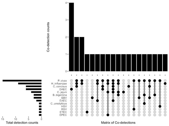 Upset plot illustrating co-infections and co-detections of pathogens in samples from GBS patients. The pathogens detected or isolated are listed on the lower left, with the horizontal bar sizes representing the detection frequency of each pathogen. The vertical bars indicate the count of each set interaction, while the black dots and connecting lines represent the detection of the corresponding pathogen and its co-occurrence with other pathogens.