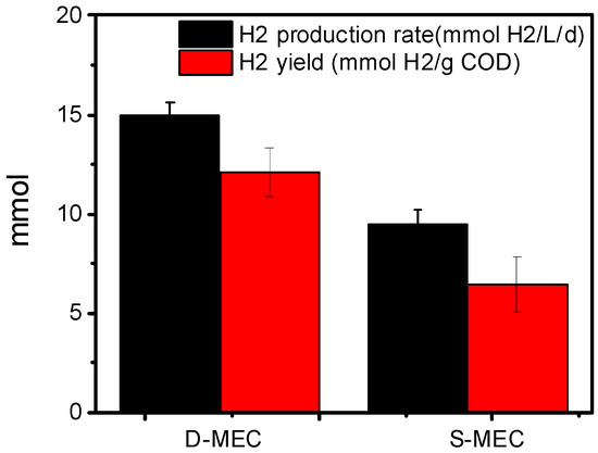 The average hydrogen production rate in S-MxCs and D-MxCs was 9.46 ± 0.8 and 14.93 ± 0.66 mmol H2/L/D, respectively (Figure 3). The total H2 yield in S-MxCs and D-MxCs was 6.48 ± 1.4 and 12.9 ± 1.3 mmol H2/g COD, respectively, which is an average of those previous studies using anode potential [9,26,35]. This suggests that the enrichment process based on the presence/absence of a posing potential on the anode does not affect the hydrogen production of MECs.