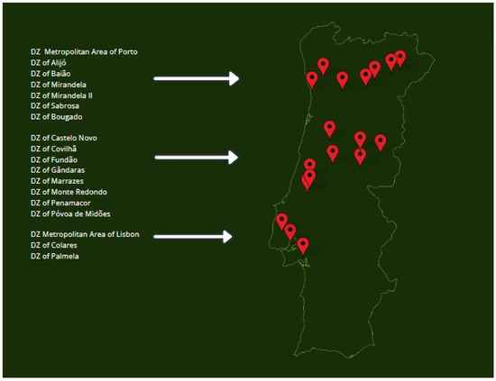 The detection of Xylella fastidiosa in Portugal occurred through prospection in 2019 in Vila Nova de Gaia, Porto, in plants of Lavandula dentata L. [14]. Currently, in Portugal, there are 18 Xf Demarcated Zones (DZs), as we can see in Figure 1, and 1 deleted DZ in Tavira in the Region of the Algarve [15].