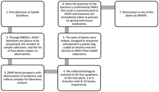 After DGAV determined the places to be prospected and the number of sample collections, DRAP North can implement the reinforcement. DRAP North prospected with observations of symptoms and collected samples for laboratory analysis whenever suspicious symptoms were observed and in plants without symptoms. Then, all prospected plants and insects must be georeferenced and registered by each prospector on the GESFITO platform for coding.