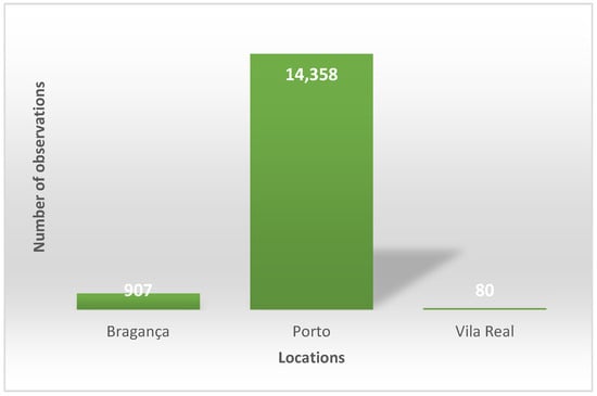 Locations observed in the northern districts of Portugal: Porto—14,358 observations (93.6%); Bragança—907 observations (5.9%); Vila Real—80 observations (0.5%).