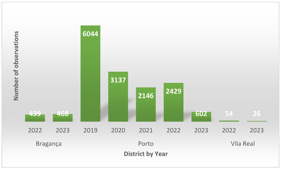 Figure 4 presents the count of locations surveyed from 2019 to June 2023. In the Porto district, there are the DZ of Área Metropolitana do Porto, DZ Baião, and DZ Bougado. In the Bragança district, you will find DZ Mirandela and DZ Mirandela II. Lastly, in the Vila Real district, there are DZ Sabrosa and DZ Alijó. Notably, 14,358 out of 15,345 locations were examined in Porto (93.6%). This discrepancy can be attributed to the establishment of the first DZ of Porto in 2019. The regions of Bragança (5.9%) and Vila Real (0.5%) began sample observations in 2022, reflecting a lower number of observations.