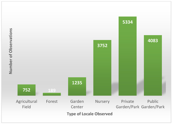 Type of locale observed in the North Region of Portugal. (1) Private garden/park, 5334 observations, 34.8%; (2) Public garden/park, 4083 observations, 26.6%; (3) Nursery, 3752 observations, 24.5%; (4) Garden center, 1235 observations, 8.1%; (5) Agricultural field, 752 observations, 4.9%; and (6) Forest, 189 observations, 1.2%.