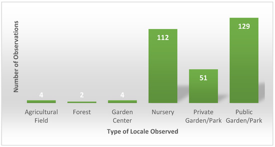 Upon analyzing Figure 7, it becomes apparent that public gardens (42.7%) accounted for the majority of positive plant results, followed by nurseries (37.1%) and private gardens (16.9%).