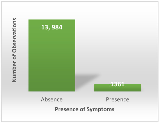 Presence of symptoms in the positive prospected plants in the north of Portugal. Absence—13,984 observations, 91.1%; presence—1361 observations, 8.9%.