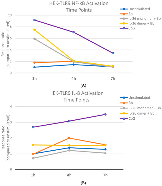 We first aimed to establish the B. burgdorferi DNA stimulation conditions of the HEK-TLR-9 system. Although CpG stimulation led to an increase in IL-8 activation over time, the recognition of B. burgdorferi DNA by TLR-9 caused maximal IL-8 activation at 4 h. At this time point, B. burgdorferi DNA’s stimulation of TLR-9 led to detectable NF-κB activation that was consistent throughout the observed period (Figure 1). We then decided that HEK-TLR-9 cell stimulation with 250 ng of B. burgdorferi DNA for 4 h appeared to be a good time point for the evaluation of NF-kB and IL-8 activation. It is important to note that B. burgdorferi DNA exposed to the IL-26 dimer for one hour increased IL-8 activation to a level higher than the IL-26 monomer or B. burgdorferi DNA alone (Figure 1B). IL-8’s activation by CpG seemed to increase over time, while the opposite occurred with NF-κB’s activation, which appeared to decrease.