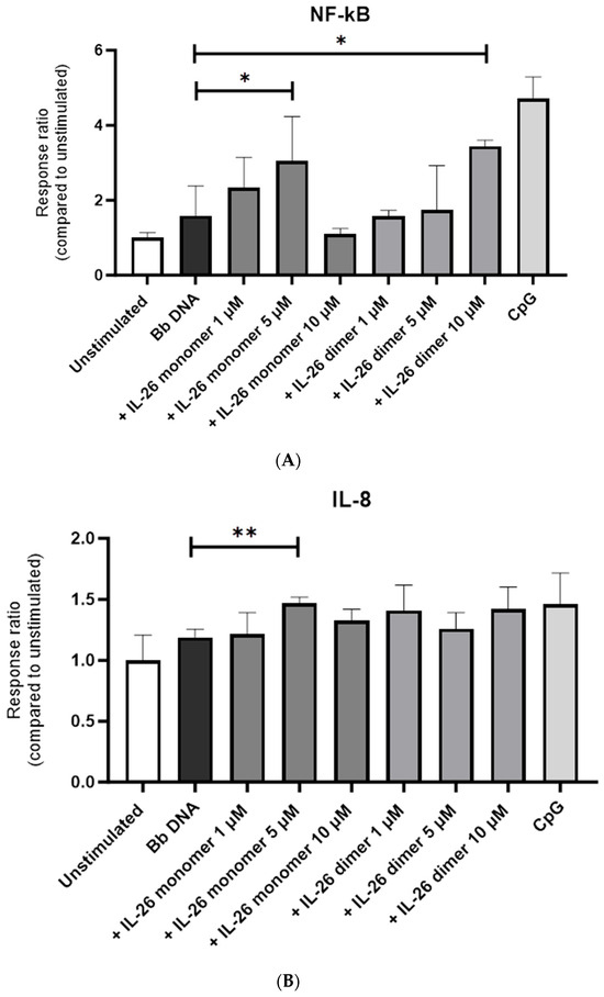 We then treated B. burgdorferi DNA with 1, 5, or 10 µM of either IL-26 monomer or IL-26 dimer for 4 h. We observed that NF-κB’s activation was maximal when the cells were stimulated with B. burgdorferi DNA that had been treated with 5 µM of IL-26 monomer and 1 µM of IL-26 dimer (Figure 2A). The same was observed for IL-8’s activation (Figure 2B).