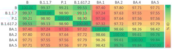 The percent identity of the amino acid sequences of S proteins from SARS-CoV-2 VOCs was lower between the P.1 and BA.1 variants (97.16%) and higher between the BA.4 and BA.5 variants (99.84%; Figure 1). Taking the lineage B as a reference, amino acid insertions in the BA.1 variant and amino acid deletions in the B.1.1.7, BA.1, BA.2, BA.4, and BA.5 variants were noted in the NTD, and the last four featured most of the amino acid substitutions found in the molecule, especially in the RBD (Figure S1). TM was the only domain where no mutations were detected across all VOCs (Figure S2).